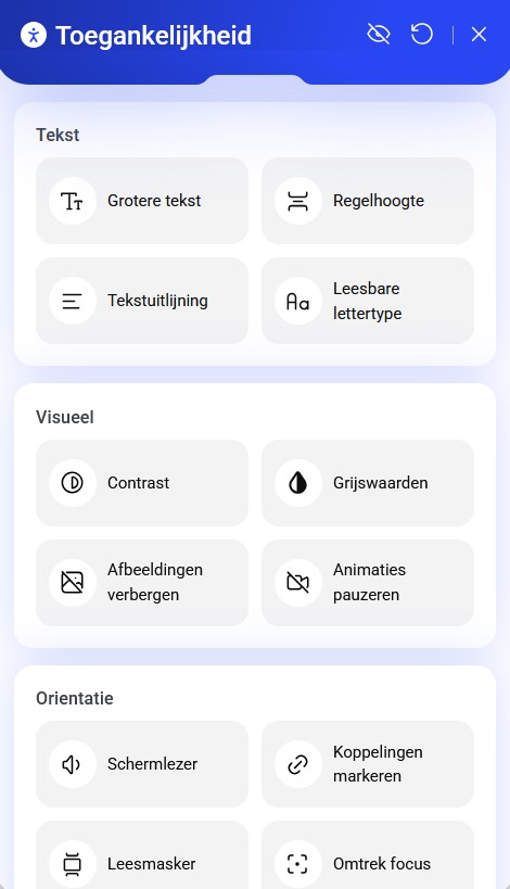 Bezoekers kunnen de weergave beter afstemmen op hun behoeften (bijv. leesbaarheid, focus-ondersteuning en rustigere weergave), zodat je site voor meer mensen prettig te gebruiken is.